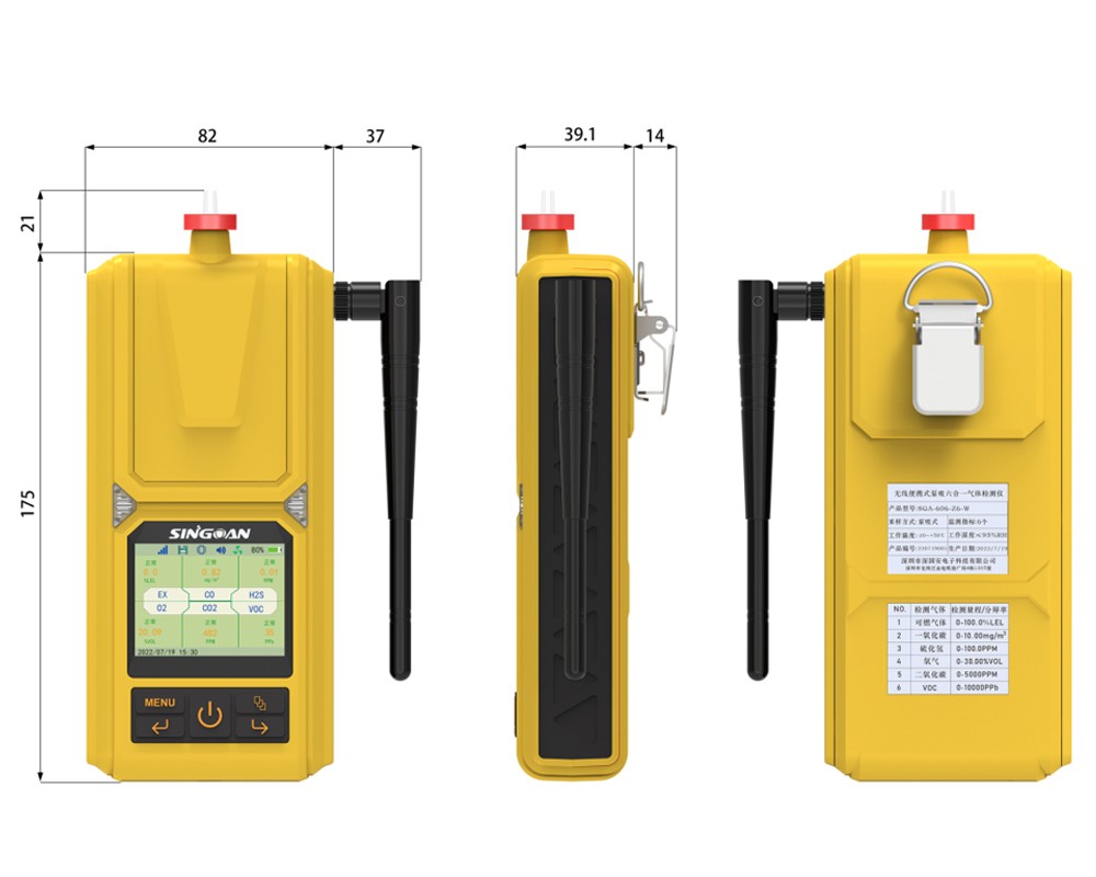 SGA-606系列便攜式六合一惡嗪氣體檢測儀小巧輕便,功能強大。2.4英寸高清液晶彩屏,實時顯示檢測目標氣體濃度值;內置高性能采樣泵,1-10檔流速可調;5000mA超大容量鋰電池,可連續工作20小時以上;內置全生命周期監控系統,傳感器壽命到期、儀表故障、校準提醒,零點自動修正等一應俱全,還可一鍵復位恢復出廠設置;中文簡體、英文、中文繁體三種語言系統,適合所有人群操作。umol/mol、ppm、ppb、%LEL、%VOL、mg/m3、ug/m3、g/m3、mg/l、g/l等濃度單位之間自由切換,氣體濃度值一目了然;支持本地存儲10萬條以上數據,自動存儲歷史記錄、報警記錄、故障記錄、開關機時間等數據,數據存儲間隔時間1-999秒可調;支持PC-TWA時間加權平均容許濃度和PC-STEL短時間接觸容許濃度:數據可通過儀器自帶的專用軟件通過USB進行導出Excel表格,進行編輯、打印、存儲等工作;標配水阱過濾器,有效過濾粉塵顆粒物和水汽,提高檢測精度,延長傳感器使用壽命;也可選配內置無線模塊,通過4G流量卡實時將監測數據上傳到物聯網平臺;智能光感控制功能,儀表會自動根據當前光照度調節屏幕亮度;大氣壓指標監測,特別適合高海拔環境下使用;標配鱷魚夾,可在使用過程中真正解放雙手,不影響正常作業;防跌倒報警功能,當人員發生意外跌倒,檢測儀則會持續進行報警,提醒其他工作人員及時救援;特別適合進入隧道、管廊、地窖、污水池、下水道、礦井、密閉空間等場所的作業人員使用;