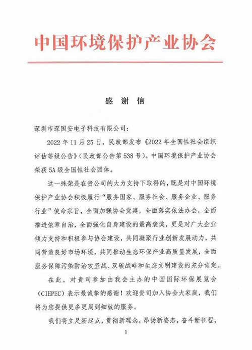 中環協給深國安發來的感謝信,希望一起努力,繼續為中國的環保事業做出自己的一份貢獻!深國安十多年來一直關注著各個行業的氣體安全,也深知行業用戶痛點,潛心研發,用科學...