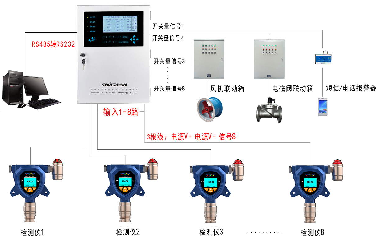 6)自帶8組繼電器開關量信號,可同時與多組電磁閥、風機等進行聯動;