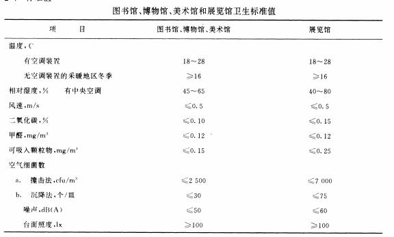 現代博物館的功能包含了搜集、保存、修護、研究、展覽、教育、娛樂七項。形態上包括建筑物、植物園、動物園、水族館、戶外史跡、古城小鎮博物館化、長期仿古代生活展示(民俗村),以及視聽館、圖書館、表演館、檔案資料館等。內容上一般分為美術館、歷史博物館、人類學博物館、自然歷史博物館、科學博物館、地區性博物館及特別專題博物館等。國家針對圖書館、博物館、美術館、展覽館等場所的衛生標準值頒布了一套標準(GB 9669-1996),明確規定了上述場所內的微小氣候、空氣質量、噪聲、照度等標準值。見下表: