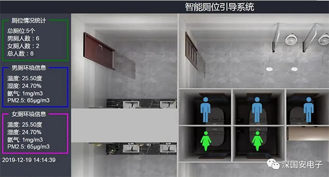 廁所想必一直是大家心中不太愿意提到的區(qū)域,傳統(tǒng)廁所由于缺少人員打理,異味較重,惡臭異味污染日益嚴峻,已成為行業(yè)備受關(guān)注的一個難題!為進一步提高公共廁所管理水平,建立管理機制,建設(shè)現(xiàn)代新都市、塑造“智慧城市”的智能化公共廁所,深國安利用物聯(lián)網(wǎng)技術(shù),研發(fā)一款新型公廁專用物聯(lián)網(wǎng)臭氣在線監(jiān)測系統(tǒng),該設(shè)備通過物聯(lián)技術(shù)可實現(xiàn)對廁所人流、廁位空余、臭氣異味等環(huán)境進行監(jiān)測,并且通過配套軟件將信息實時顯示在大屏幕上。