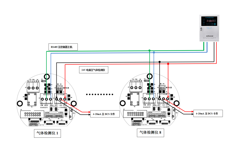 氣體檢測儀四線制多為RS485輸出信號,其布線多為總線制,即手拉手串聯布線。四線制的報警器中一般有四個接線端子,分別對應供電正負和485信號正負,一般端子表示分別為VGAB,在四線制接線中,只需要將每個可燃氣體探測器的VGAB端子串聯至另外一臺報警器的VGAB端子即可。